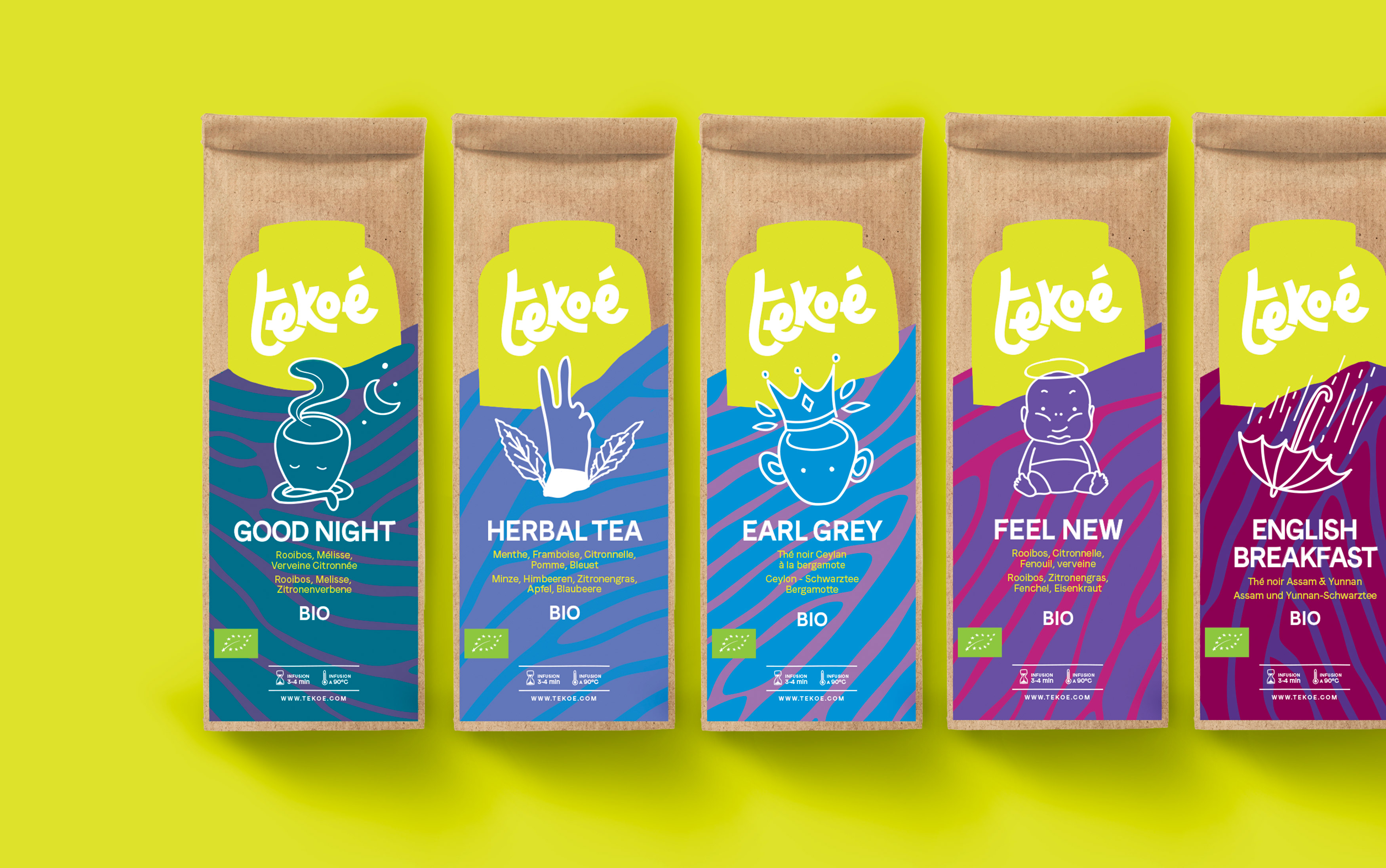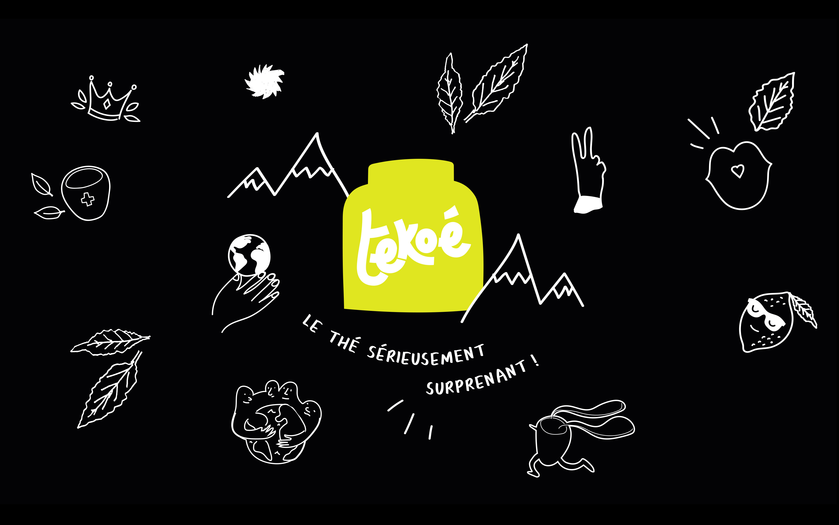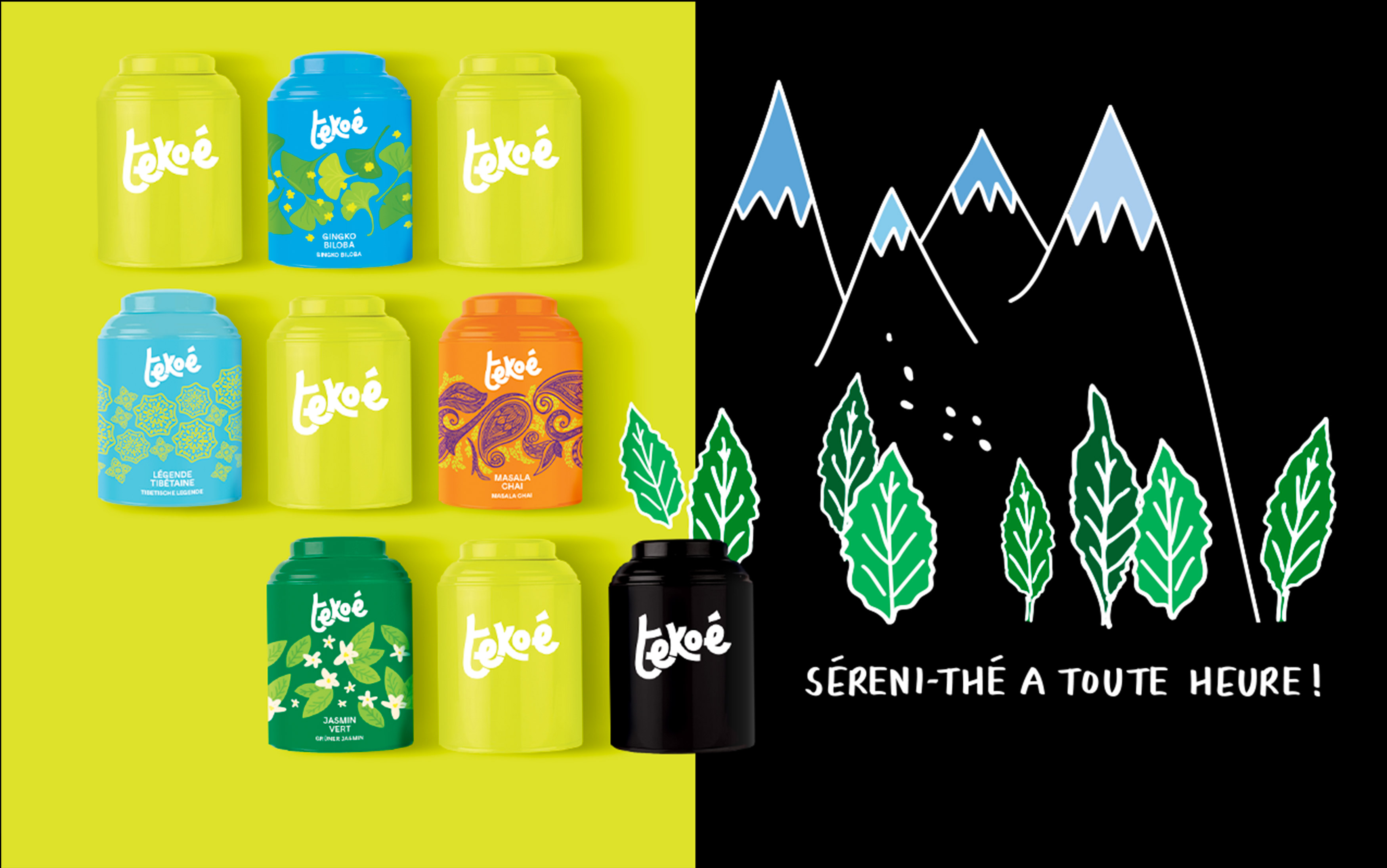 A new brand universe for the Swiss tea house Tekoé, new packaging, all joyfully committed and impertinent! Identity co-created with Virginie Gailing.