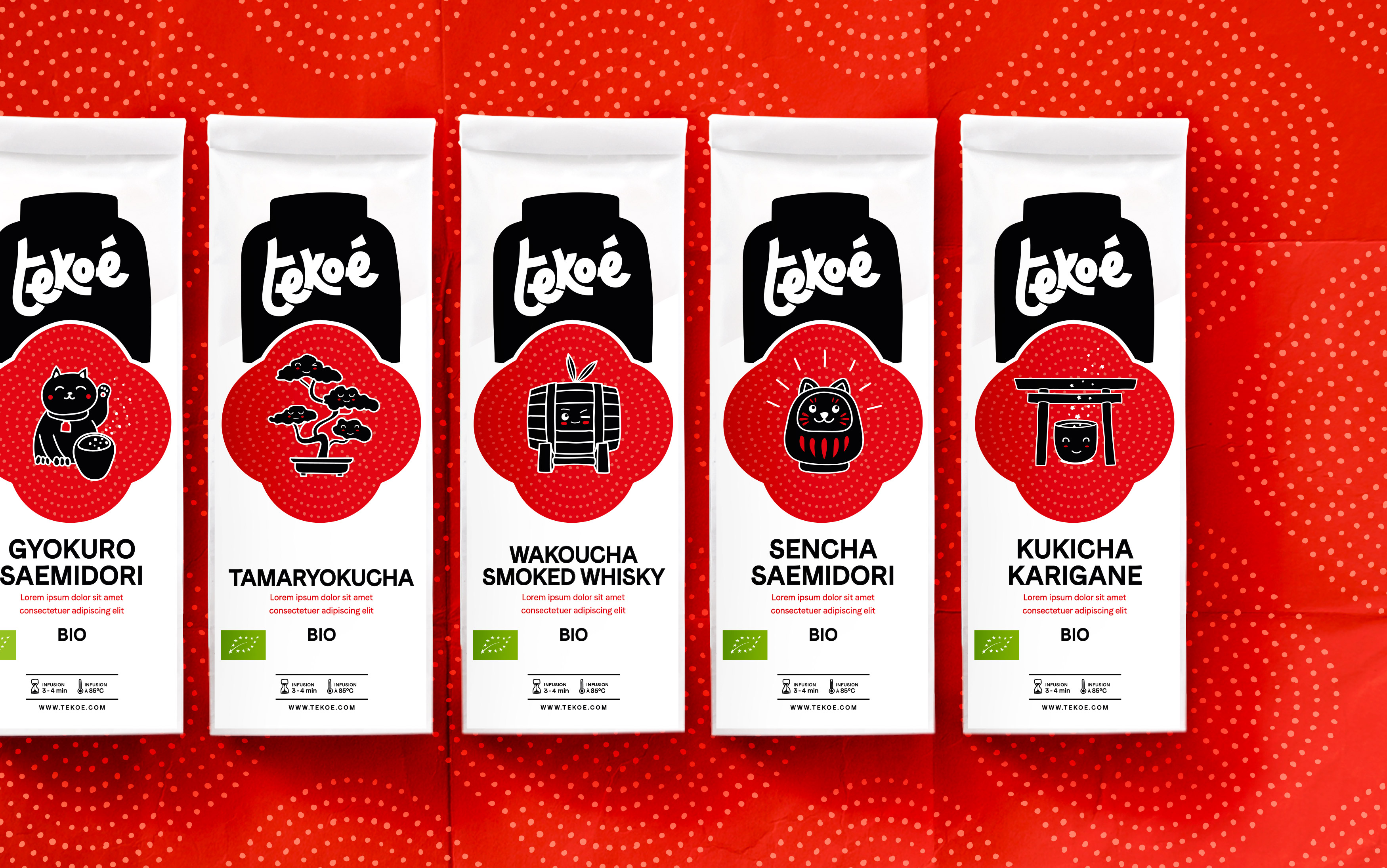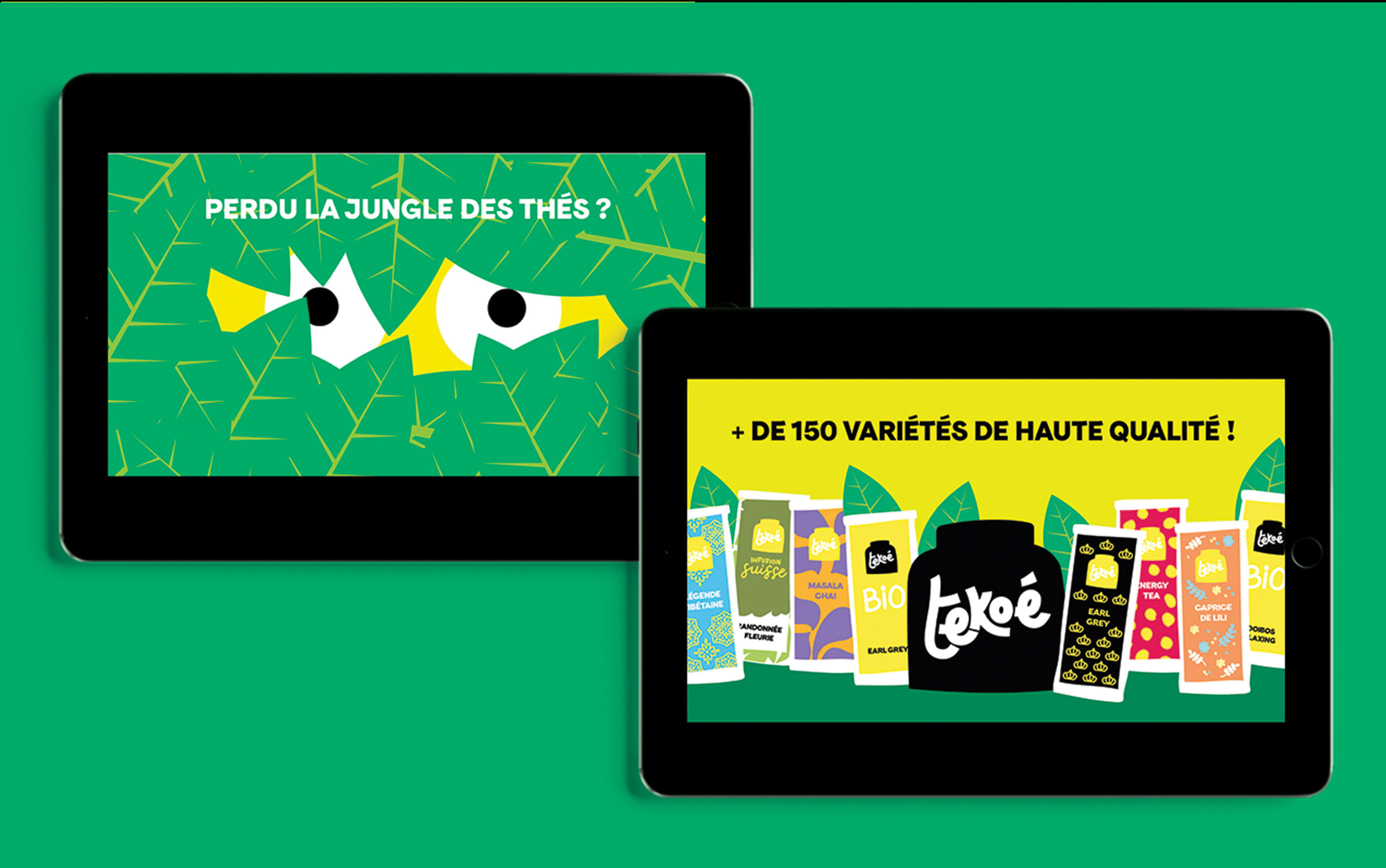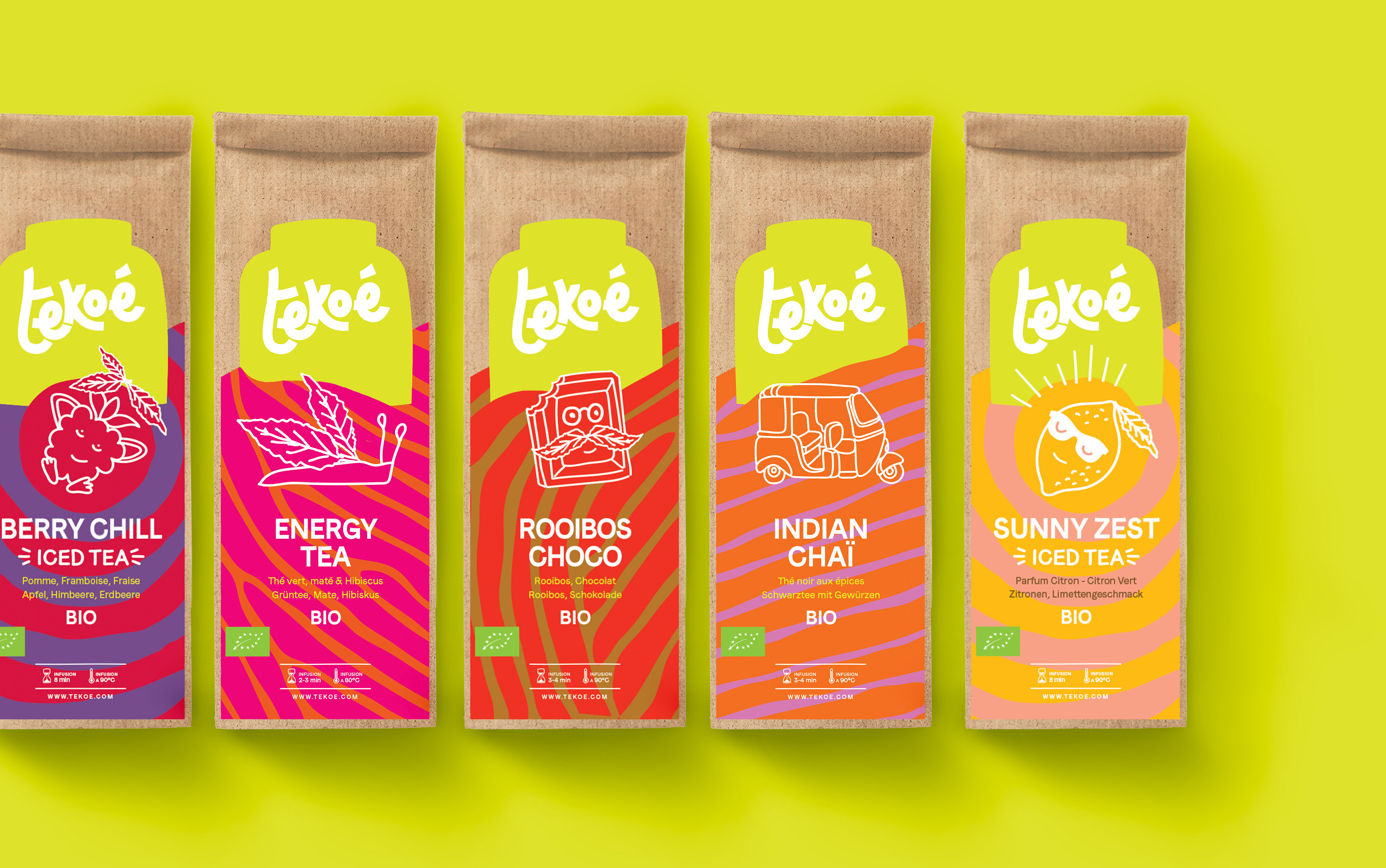 A new brand universe for the Swiss tea house Tekoé, new packaging, all joyfully committed and impertinent! Identity co-created with Virginie Gailing.
